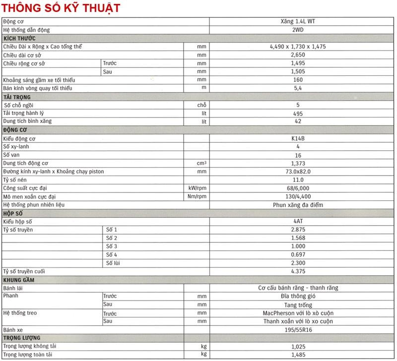 - Kích thước: D x R x C = 4.490 x 1.760 x 1.475.